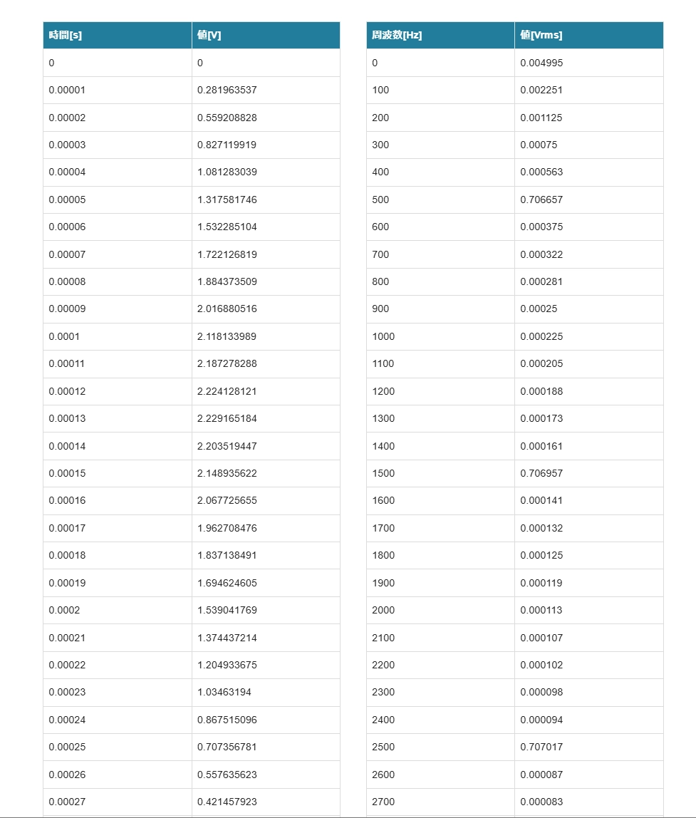 さらに、グラフの下には時間領域および周波数領域のデータテーブルが表示されます。テーブルはセル選択やコピーにも対応しており、解析結果をそのまま他のツールへ活用することも可能です。